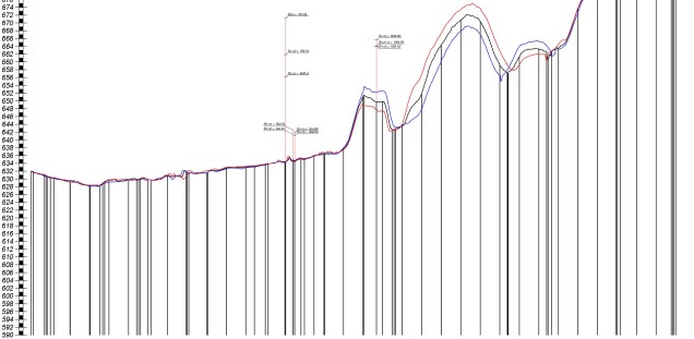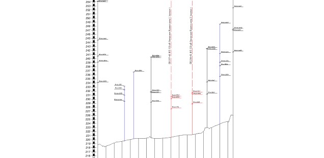 - Продольный профиль показывает изменение высоты вдоль трассы линейного сооружения, например, автомобильной или железной дороги, трубопровода, линии электропередач и т.д. Необходим для контроля уклонов, расчета объемов земляных работ, анализа просадок и деформации грунтов при проектировании трассы.